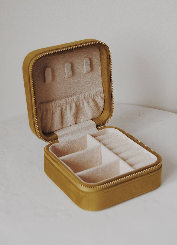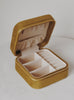 - interior includes necklace hooks, pouch, moveable dividers, and ring section
