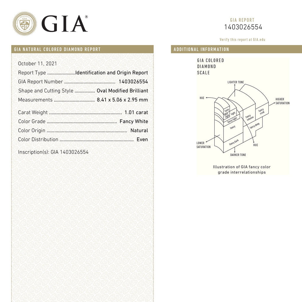 1.01ct 8.41x5.06x2.95mm GIA Fancy White Oval Brilliant 20943-01