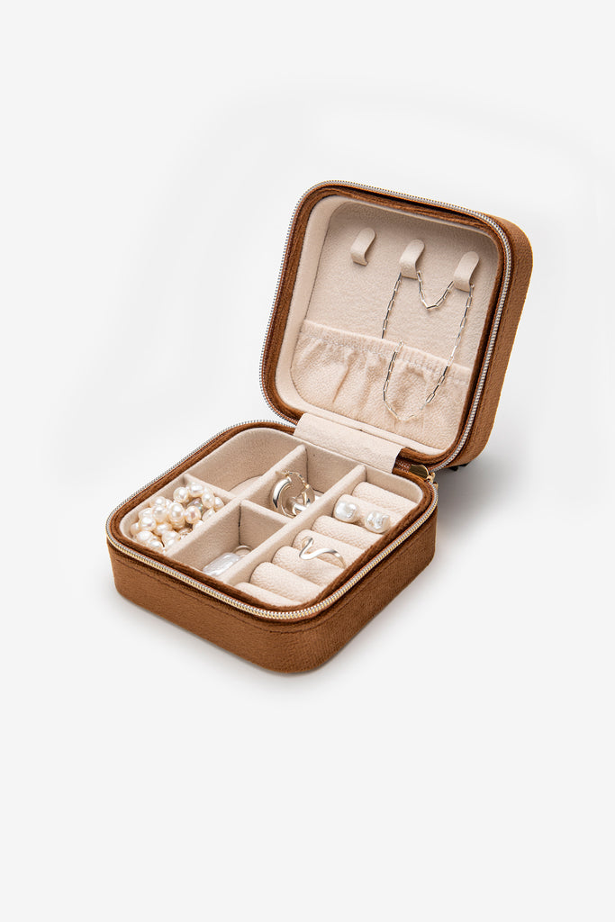 - square jewelry box with velveteen interior lining and velvet exterior