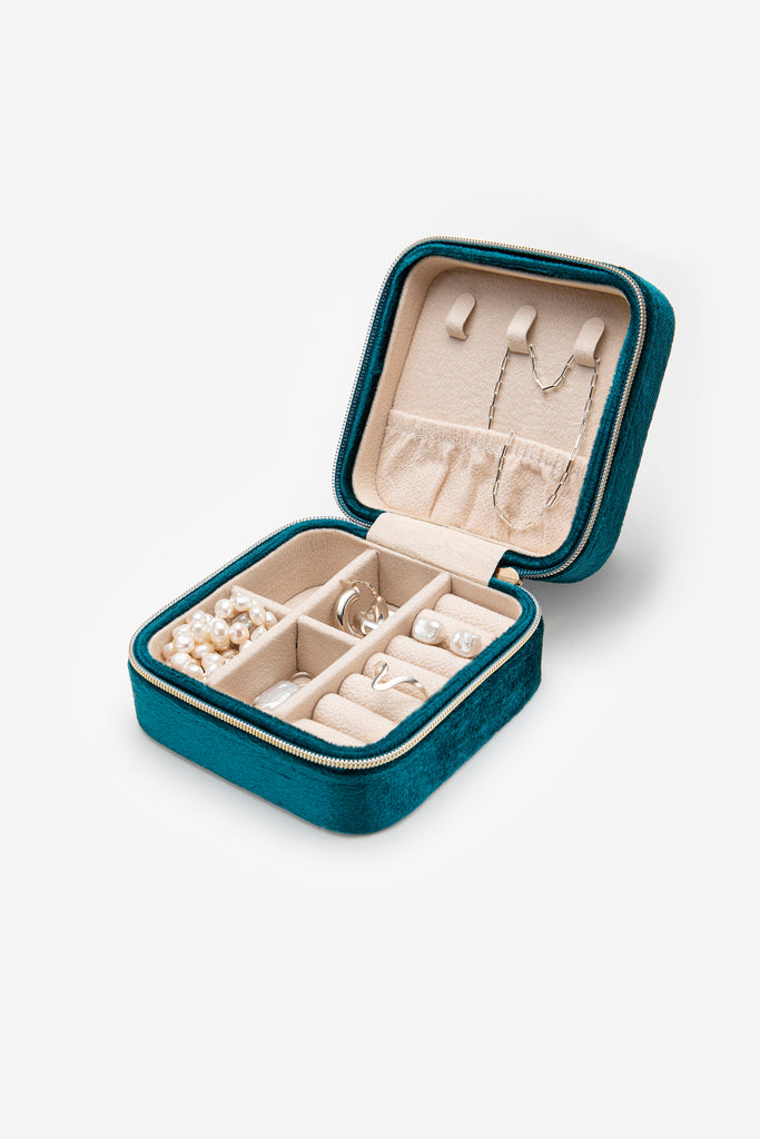 - interior includes necklace hooks, pouch, moveable dividers, and ring section
